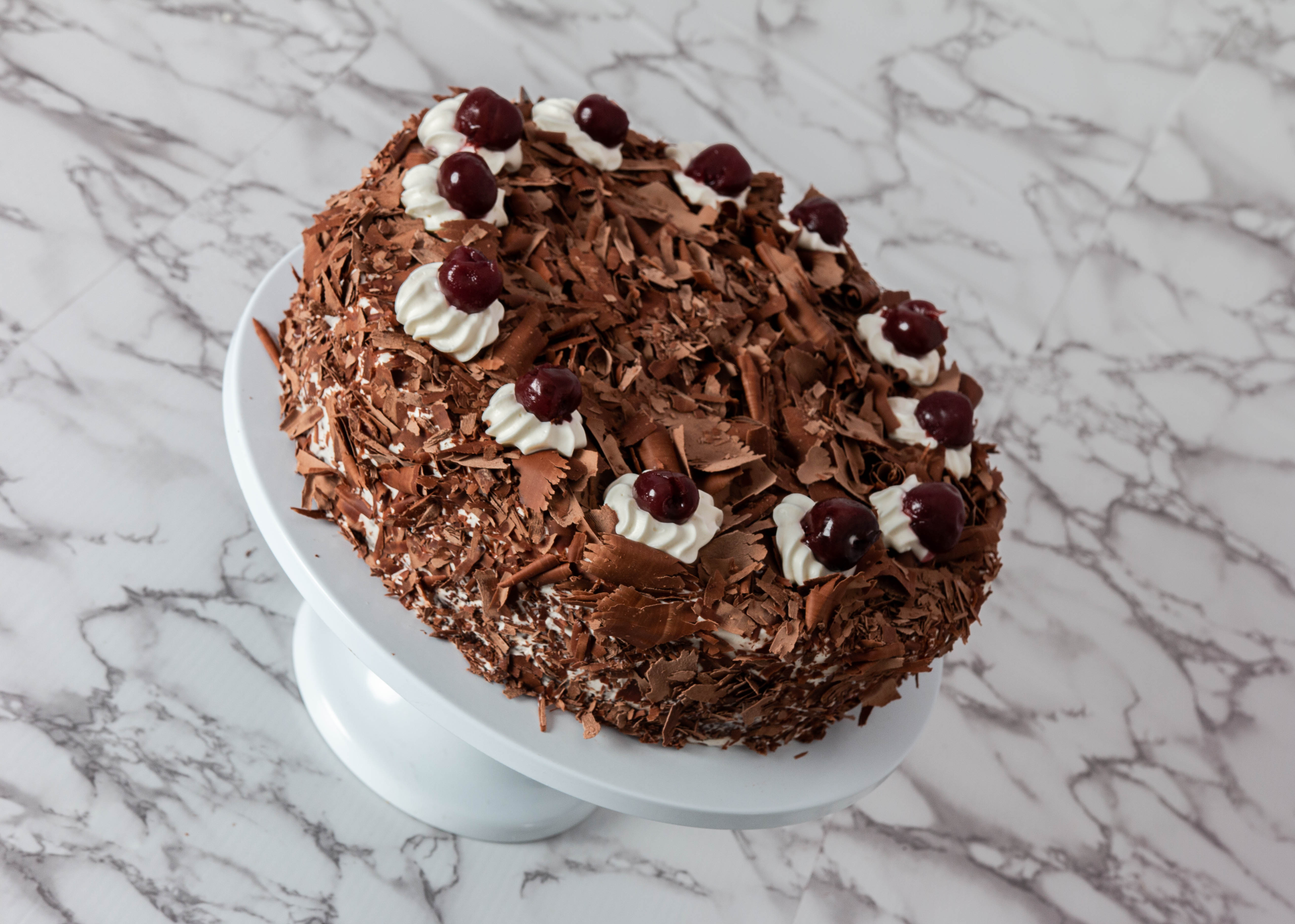 Delicioso pan de chocolate bañado con licor de cereza negra y relleno de crema con cerezas negras, cubierto de rizos de chocolate y cerezas negras.