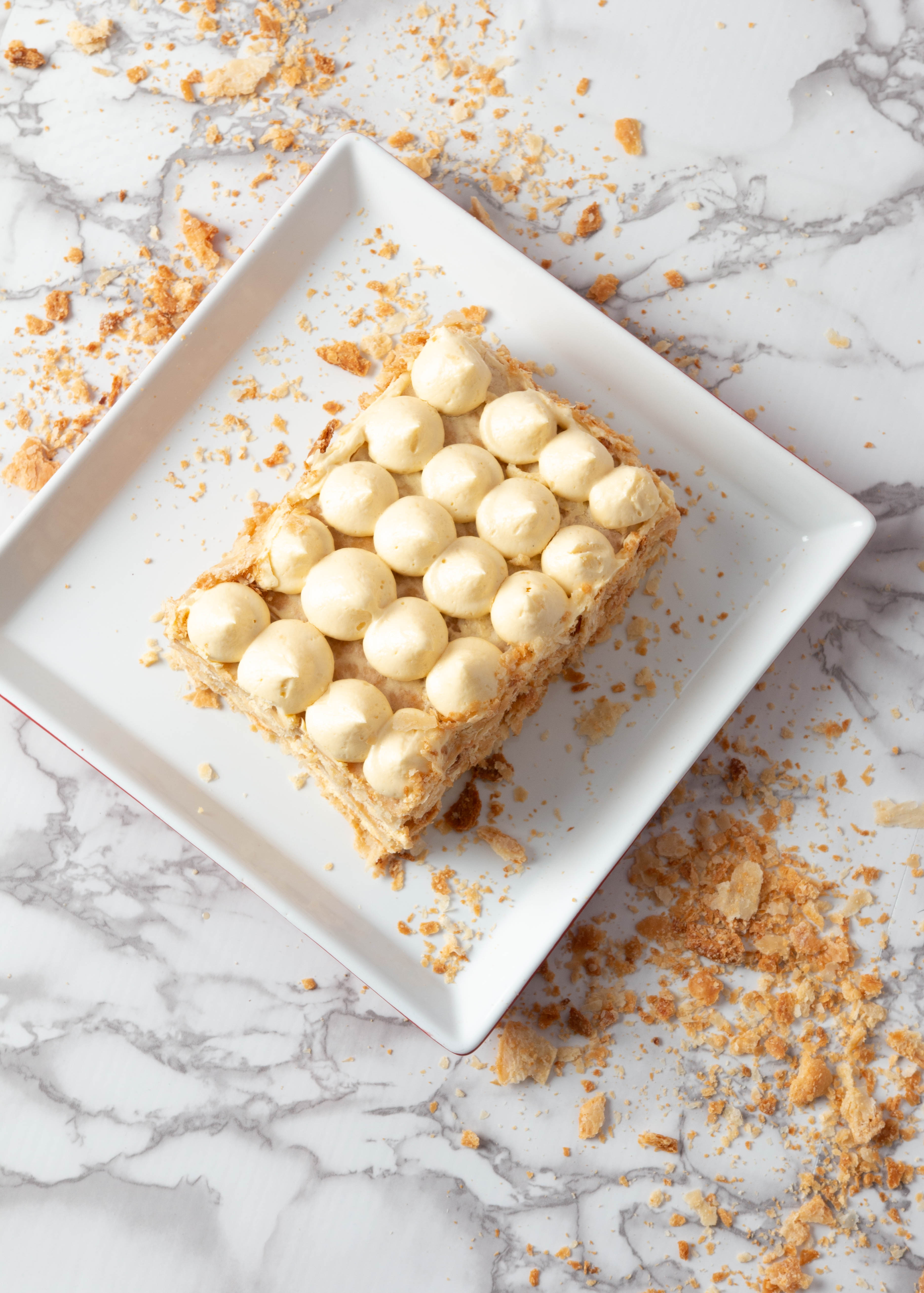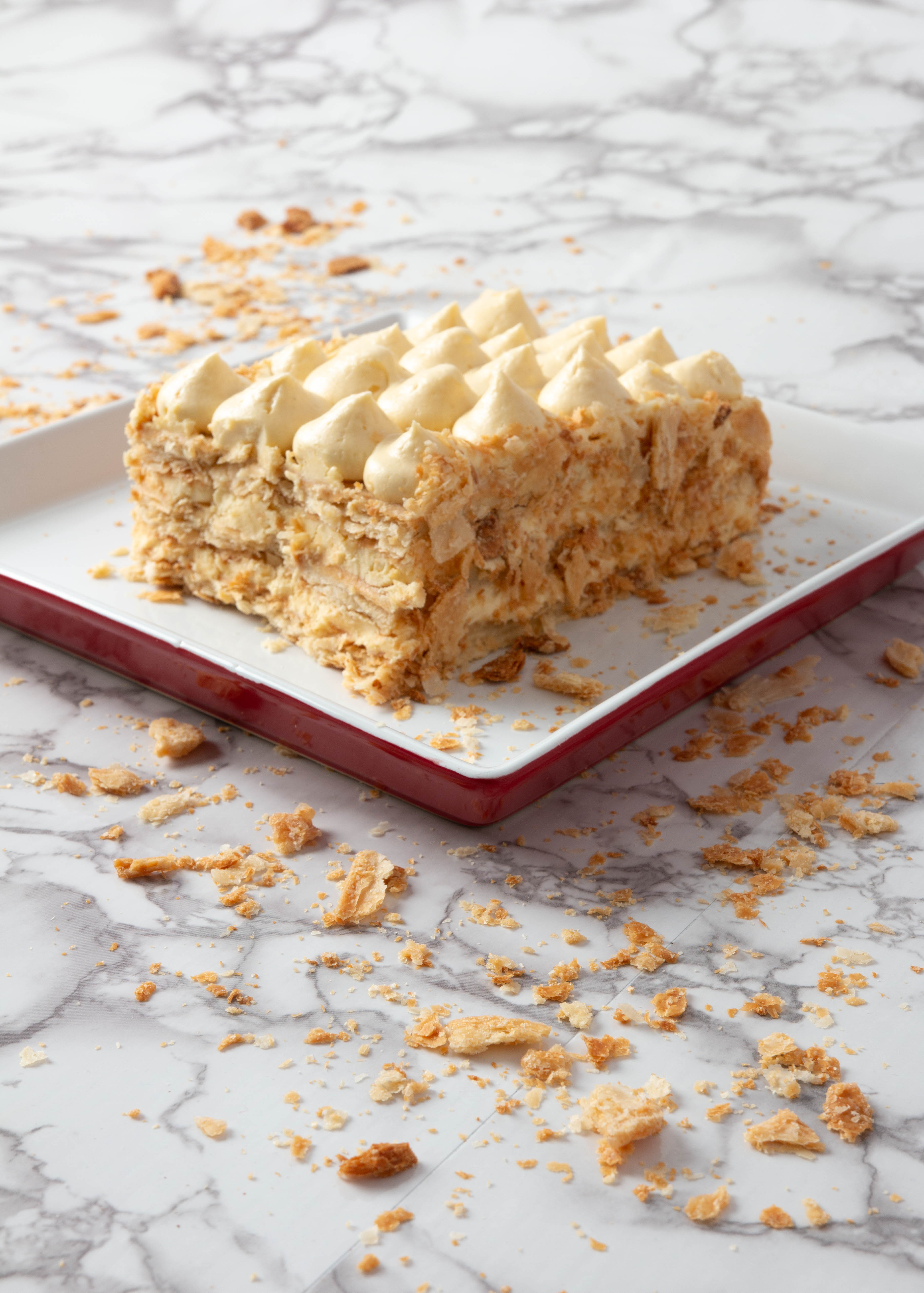 Capas crujientes de hojaldre con relleno de crema pastelera.